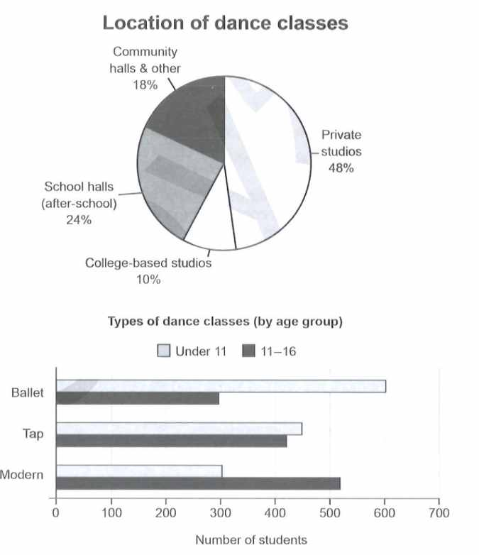 The charts below give information on the location and types of dance classes young people in a town in Australia are currently attending. Summarise the information by selecting and reporting the main features, and make comparisons where relevant.