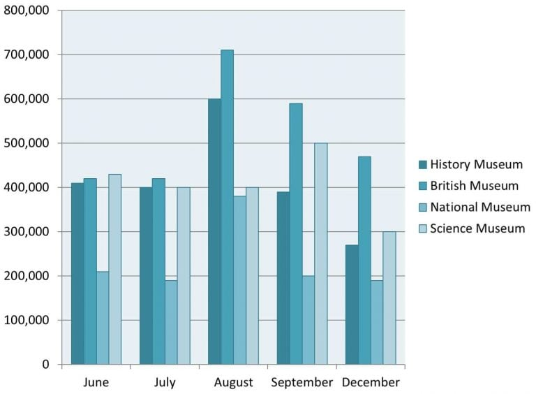 Overall, the highest number of visitors preferred to visit to museums in August, while British museum had most visitors in this time of period. Notably, the number of visitors of Science museum were almost stable in every month.