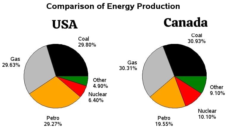In the USA, coal accounted for 29.8% of energy production, and this figure was slightly higher in Canada at 30.93%.