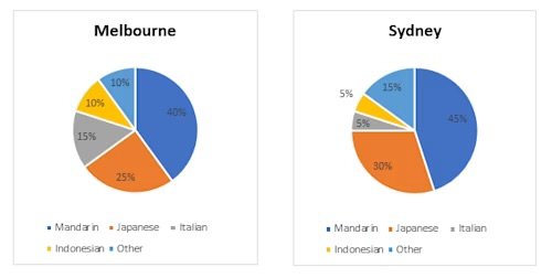 In terms of Melbourne, Mandarin was the most popular language at 40%, followed by Japanese, which accounted for 25%. On the other hand, Italian, Indonesian, and Other languages were less popular. Indonesian and Other both made up 10%, while Italian represented 15%.