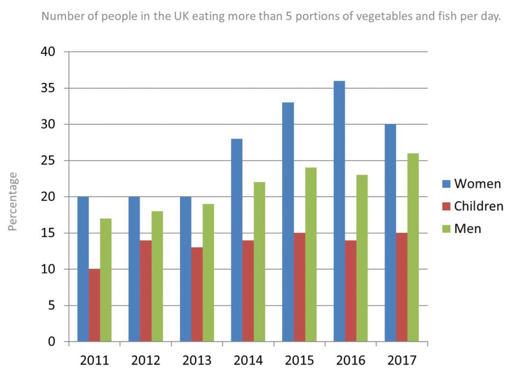 The bar chart illustrates the number of people in the UK eating more than 5 portions of vegetables and fish per day.