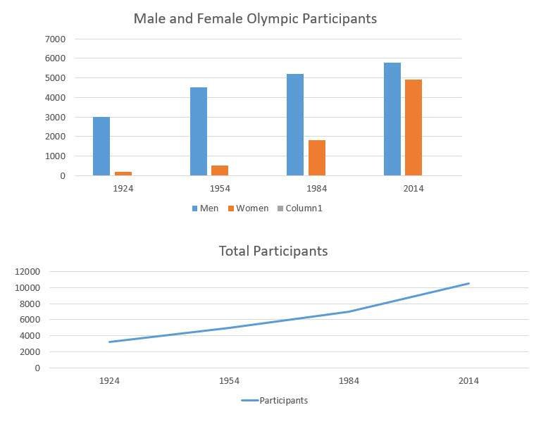 The bar chart illustrates the number of male and female Olympics participants and the line graph shows total participants at the Olympics every 30 years between 1924 and 2014 in total and by gender.