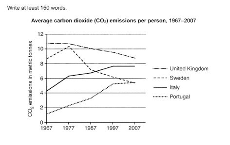 The line graph illustrates the percentage of carbon dioxide emissions each people in UK, Sweden, Italy, Portugal between 1967 and 2007.