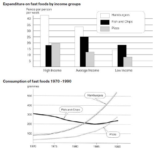 9. The bar chart illustrate the amount of money per week expenditure on fast food in Britain, While the line chart compares trends in consumption of the fast food in the year 1970 to 1990.