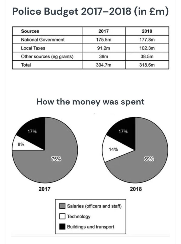 The table and charts below give information on the police budget for 2017 & 2018 in one area of Britain. The table shows where the money came from and the chart show how it was distributed